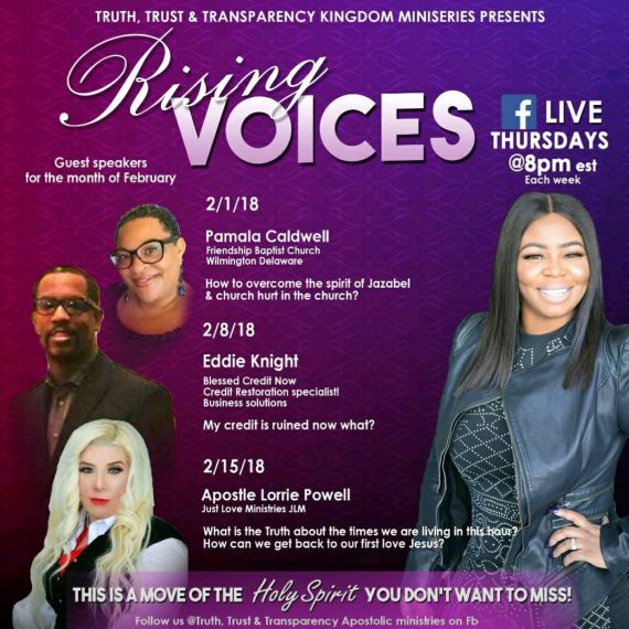 Truth Trust & Transparency Kingdom Ministries, was birth by God 2018. Our purpose is to display the heart of father and help Gods children realign with purpose and his will for their lives!!! We live in freedom and Liberty in Christ and want the same for the body of Christ.